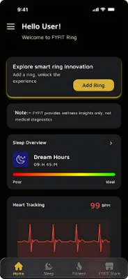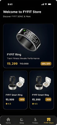 Förvandla din hälsoresa med FYFIT, din banbrytande följeslagare för välbefinnande, sömlöst integrerad med en smart ring. Upptäck en helt ny dimension av personlig hälsoövervakning, direkt från fingertoppen. FYFIT-appen synkroniserar kontinuerligt vitala data – som puls, syremättnad i blodet och sömnmönster – för att ge dig ovärderliga insikter. Den mångfunktionella displayen erbjuder en snabb överblick av tid, steg, hjärtfrekvens, SpO2 och sömnkvalitet, vilket stärker din väg mot optimal hälsa och en förbättrad livskvalitet.